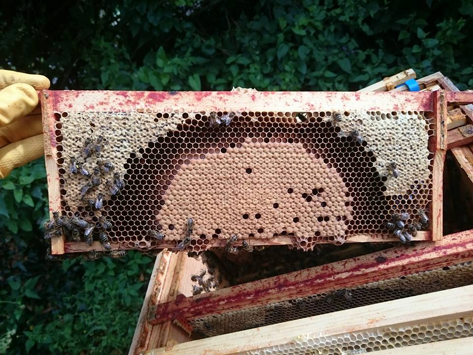 There are no eggs present on this frame. If there were I’d be able to tell how long ago they were laid and therefore when the queen was present. Eggs are shaped like tiny grains of rice: if they’re on their tip she was there in the last day and they slowly become horizontal over the course of the three days.